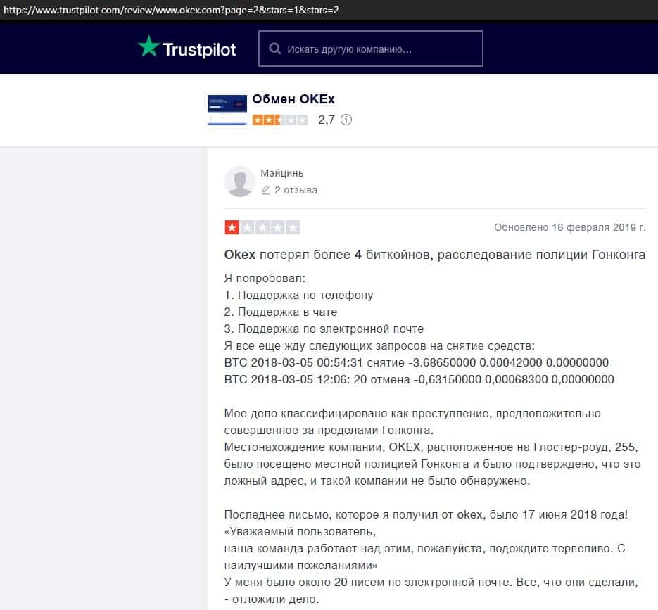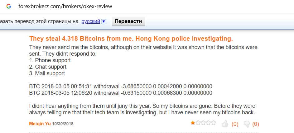 В этом отзыве жертва развода рассказывает, как контора OKEx опрокинула его на 4 биткоина. Они присвоили себе его деньги и человек теперь обратился в местную полицию.