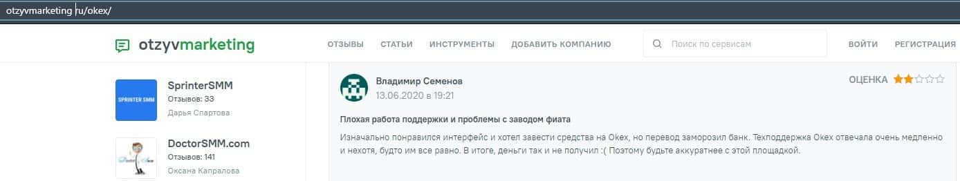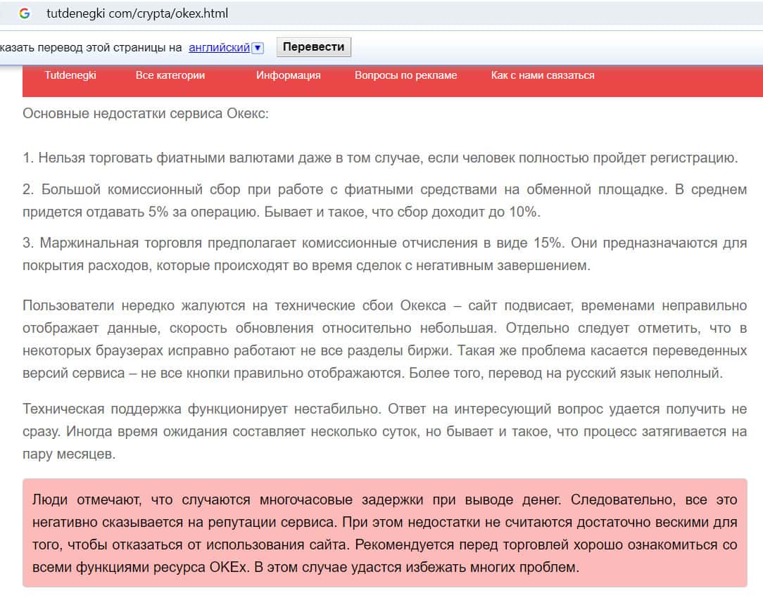 На сайте cryptonisation ru также была опубликована статья о компании ОКекс. Авторы нашли в ее работе множество минусов. К ним относятся большие комиссии, проблемы со вводом и выводом денег, технические сбои, некорректная работа техподдержки. Минусов довольно много для такой крупной биржи.