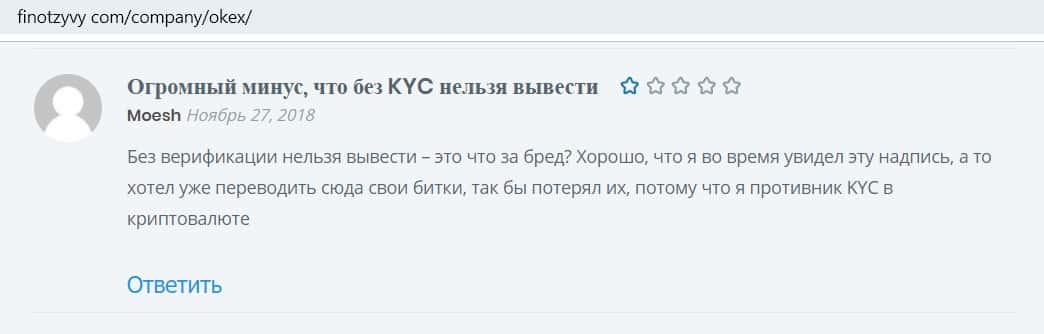 Очередной пользователь поразился странным условиям, действующим на криптоплощадке OKEx. Он не понимает, почему без прохождения верификации здесь нельзя вывести криптовалюту. По его мнению, это какой-то бред, ведь крипта не признана деньгами, тогда зачем у клиентов требуют подтверждения личности?
