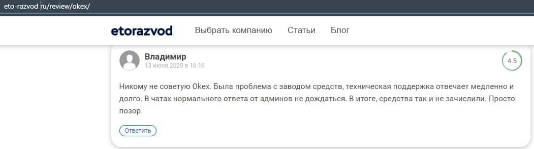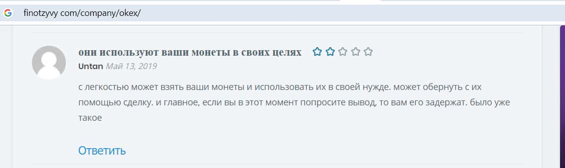 На сайте Финотзыв появился комментарий, автор которого считает владельцев биржи OKEx нечистыми на руку. Он утверждает, что компания использует средства клиентов в своих целях. Именно поэтому и случаются частые задержки с выводом денег. Компании просто нечем платить, так как она забрала себе всю крипту.