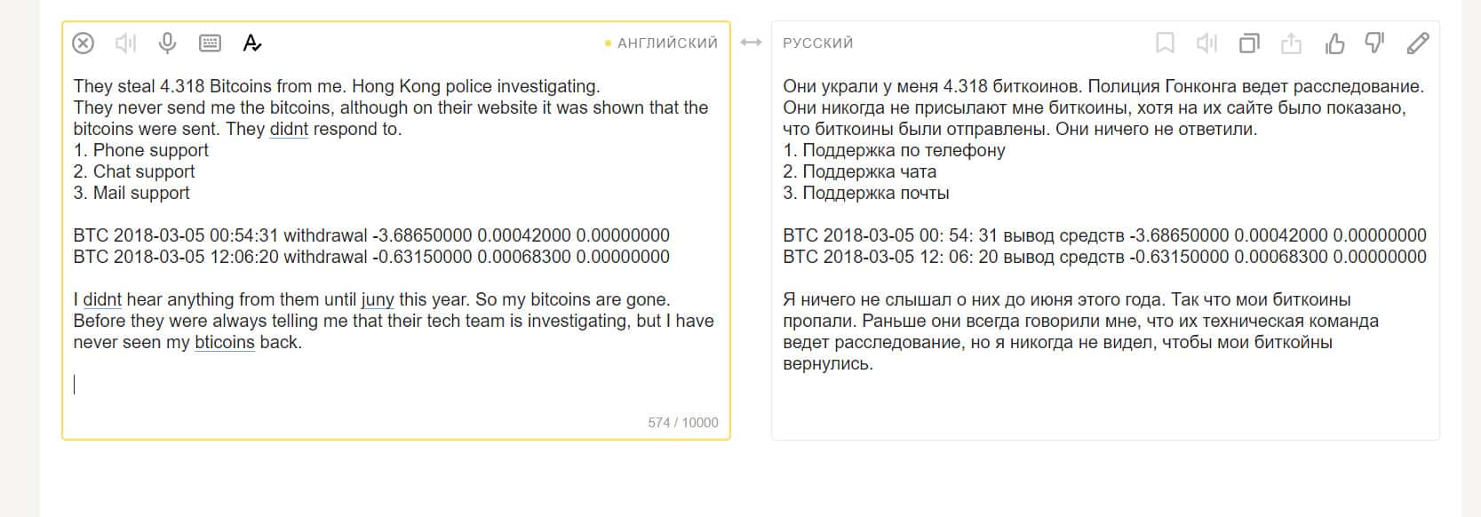 Мейкин Ю утверждает, что, судя по транзакциям, средства были перечислены на биржу, однако, на его счет они так и не поступили. В доказательство мужчина приводит две транзакции, и говорит, что он писал в поддержку, но ему никогда не отвечали. В результате он обратился в полицию Гонконга по этому поводу.