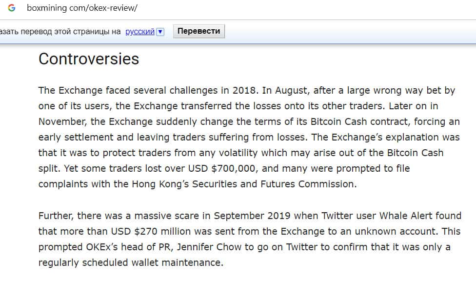 Сайт boxmining com разместил статью, где говорится о некоторых махинациях, которые совершали организаторы площадки ОКекс. В 2018 году компания перенесла крупные убытки, полученные одним трейдером, на других людей, заставив их платить за это. Также, клиенты потеряли около 700 000 долларов из-за Биткоин Кеш.