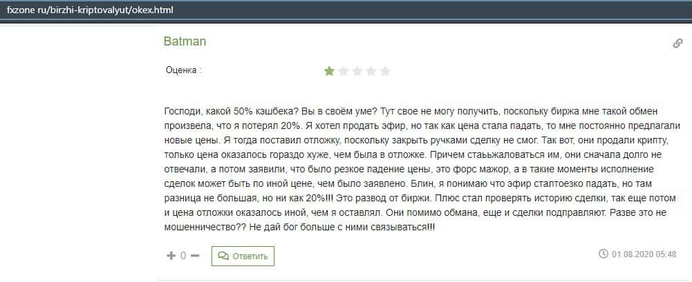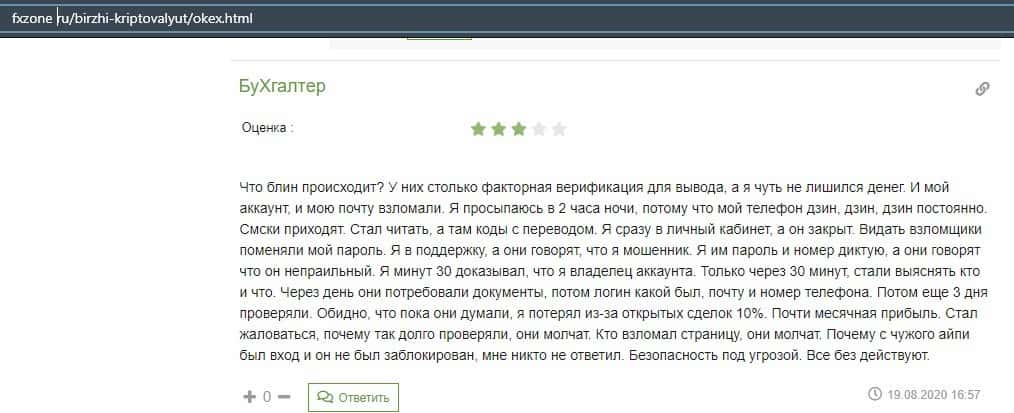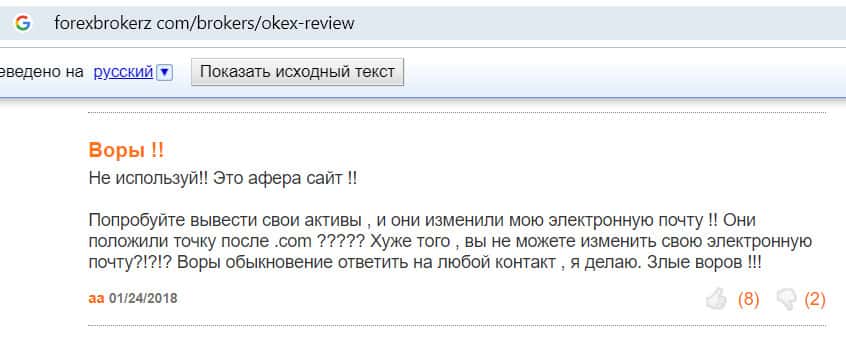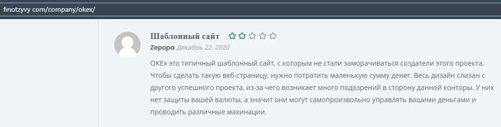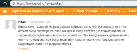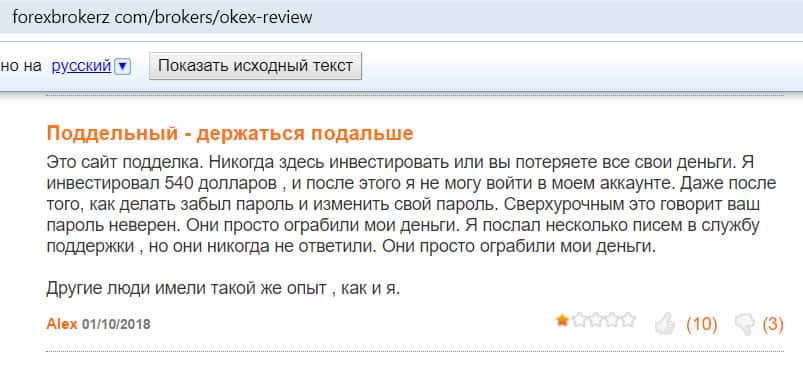 Алекс пишет в своем отзыве на сайте forexbrokerz com, что сайт ОКекс является подделкой, а не настоящей биржей. Мужчина положил 540 долларов на счет, после чего обнаружил, что не может зайти в свой аккаунт. Его просто ограбили мошенники из ОКекс. Алекс предупреждает, чтобы никто не инвестировал в этот скам проект.