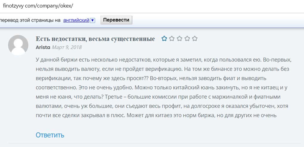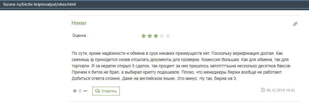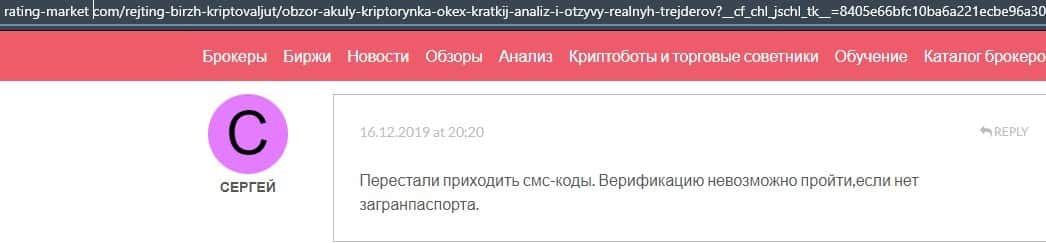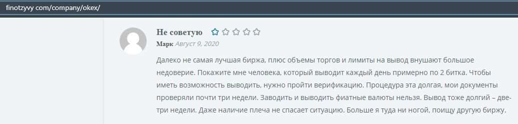 В этом отзыве описывается, что в крипто-конторе ОКекс часто тяжело пройти верификацию, если у вас нет заграничного паспорта. Так что не спешите заводить туда свои деньги.