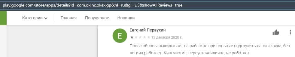 Человек отметил в своем отзыве, что после обновления торговой платформы криптовалютной кухни ОКекс, перестали работать данные аккаунта и невозможно залогиниться.