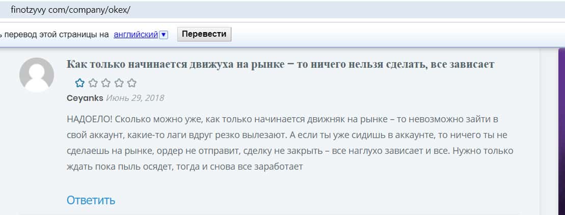 Разгневанный трейдер оставил негативный комментарий по поводу плохой работы терминала на бирже ОКекс. Как только начинается волатильность, он не может попасть в свой аккаунт, так как платформа начинает лагать и все зависает. В результате невозможно ни открыть сделку, ни закрыть.