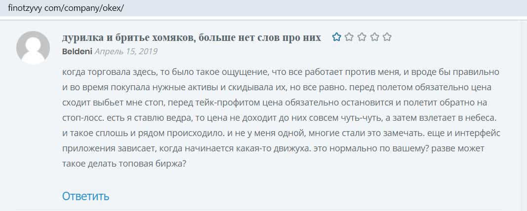 Мнение еще одного трейдера, поработавшего на бирже OKEx: людей дурят, как хотят, топовая площадка не может вредить клиентам. Девушка рассказала, что сотрудники постоянно мошенничают со сделками, намеренно уводя их в минус. Терминал постоянно виснет, как только начинается волатильность.