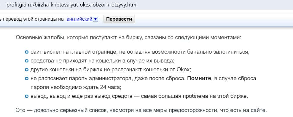 На сайте profitgid ru появилась статья о компании ОКекс, где авторы рассказали о многочисленных жалобах клиентов. В основном они связаны с тем, что средства пользователей не приходят на их кошельки после перевода со счетов. Также есть проблемы технического характера, затрудняющие работу клиентов.