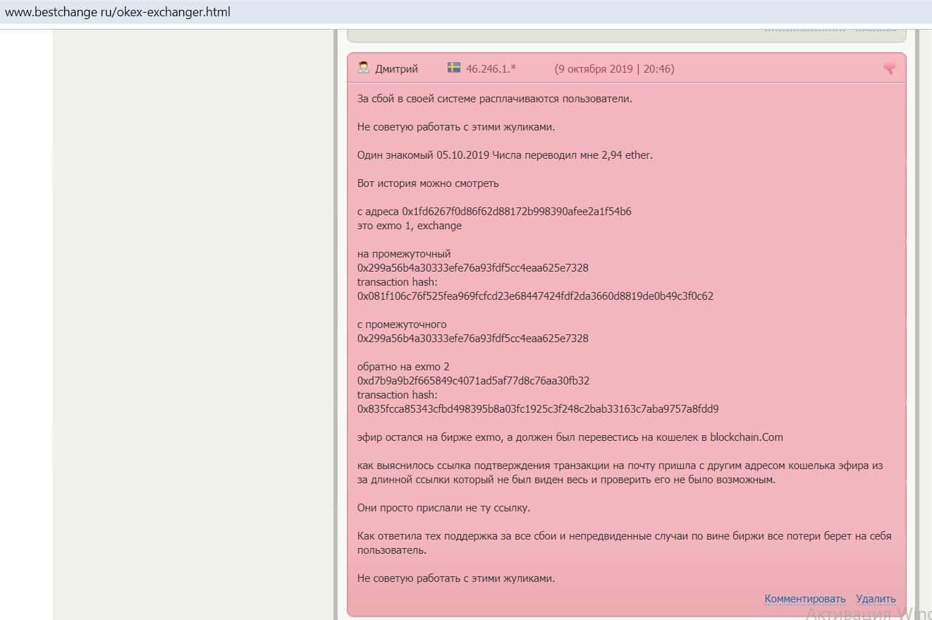 Дмитрий подробно расписал доказательства мошенничества на площадке ОКекс. Он привел все транзакции, которые совершались на его кошелек. В результате деньги ему не поступили. Когда Дмитрий стал разбираться, поддержка ответила, что за технические сбои отвечает сам пользователь, а не они.