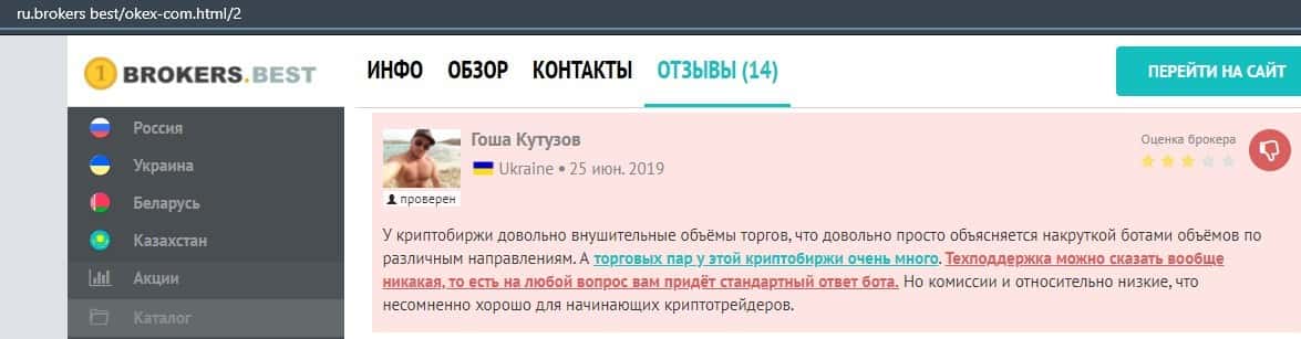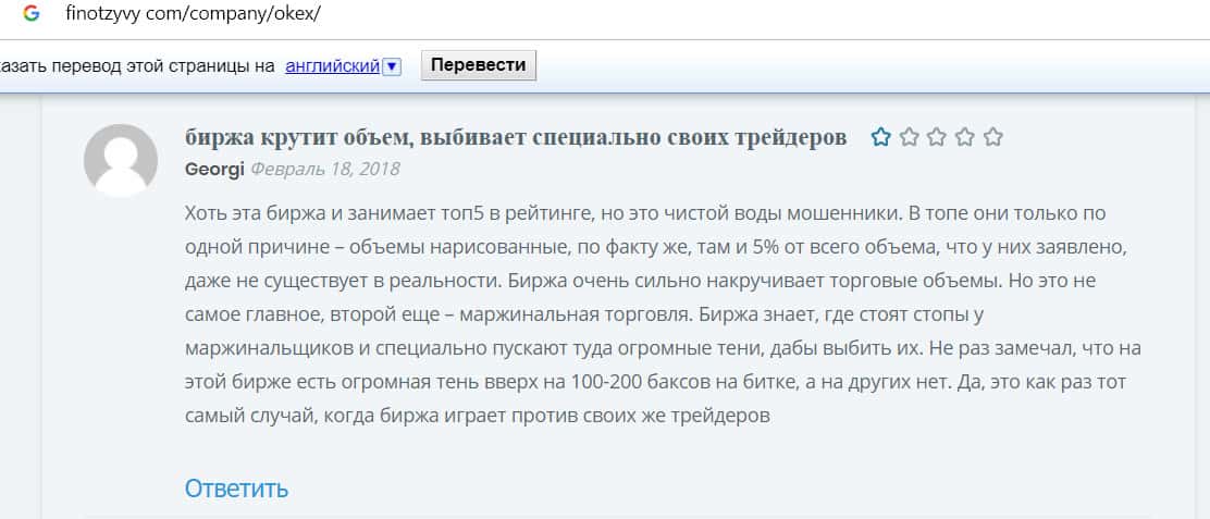 Георгий оставил негативный отзыв на сайте finotzyvy com о работе биржи OKEx. Он считает, что компания попала в топ только благодаря накручиванию объемов торгов. Также трейдер говорит, что стоп-лосы у ордеров намеренно выбивают тенями от свечей, чтобы не дать заработать. Это можно заметить, в сравнении с другими биржами.