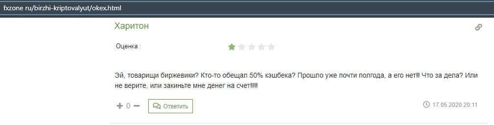 Еще один трейдер рассказал, что контора OKEx разводит клиентуру на кэшбек. Обещают около 50% от вложенного депозита, а по факту не присылают ничего. Поэтому не верьте им.