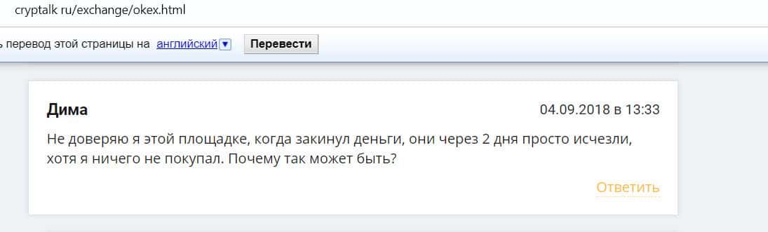 Дмитрий оставил комментарий негативного содержания о криптобирже ОКекс на сайте cryptalk ru. Он недоумевает, как так может быть, что он пополнил свой кошелек на этой площадке, а через два дня они бесследно исчезли. Об этом пишут многие пользователи, случай Дмитрия далеко не единственный.