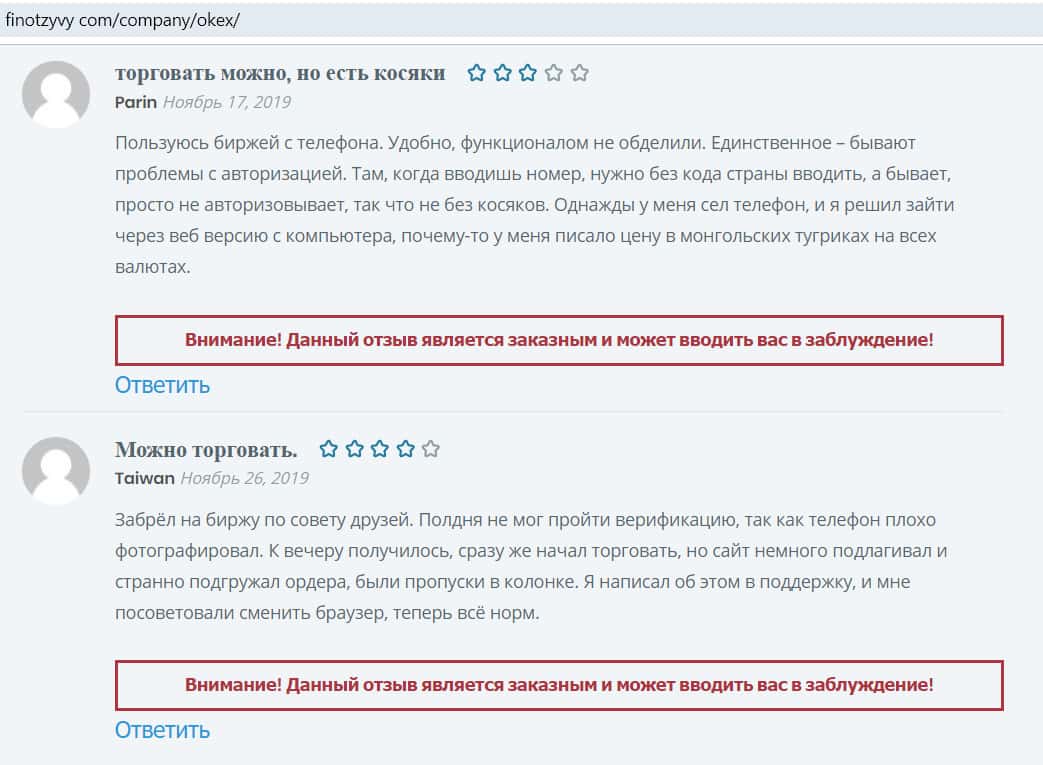 Два отзыва, идущие подряд, с положительной оценкой работы биржи OKEx, являются фейковыми. Об этом предупреждает редакция сайта Финотзывы. Комментарии похожего содержания и сделаны с разрывом в пару дней. Возможно, это не единственный случай публикации заказных отзывов об этой компании.