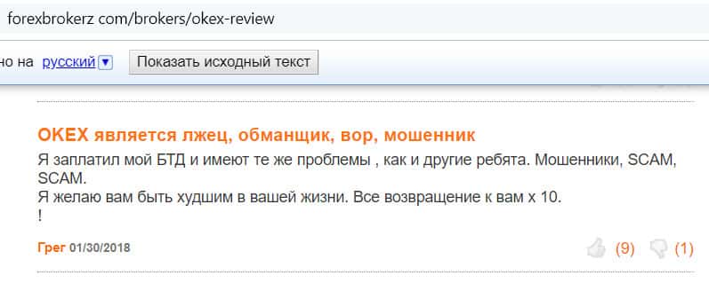 Грег в гневе назвал сотрудников фирмы ОКекс лжецами, ворами и мошенниками. Он купил биткоины на этой площадке и не смог их вывести. Грег прочитал отзывы других людей и понял, что у них таки же проблемы. Мужчина верит, что все плохое, что сделали мошенники, вернется к ним в десятикратном размере.