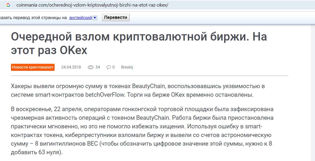 В апреле 2018 года в результате хакерской атаки с площадки ОКекс были похищены астрономические суммы в криптовалюте. Компания остановила торги, но не смогла помешать хакерам. Это наглядно показывает, что торговать на данной бирже не стоит, к тому же она имеет привычку обвинять во всем трейдеров.