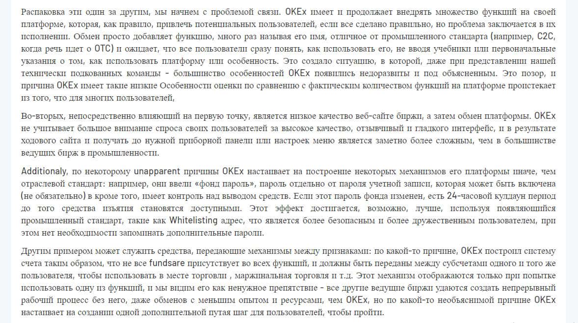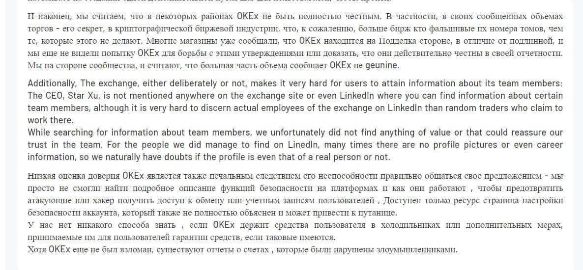 Авторы статьи говорят, что в некоторых областях работы ОКекс не может быть полностью честным. Это касается накручивания объемов торгов, что не редкость в криптоиндустрии. Также компания подтасовывает факты о своем руководстве. Также под большим сомнением безопасность биржи, она уже была подвержена хакерским атакам.