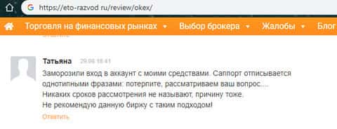 Контора ОКекс заморозила все деньги клиента и он решил об этом рассказать в своем отзыве. Ему так и не зачислили его перевод, не смотря на постоянные вопросы к поддержке.