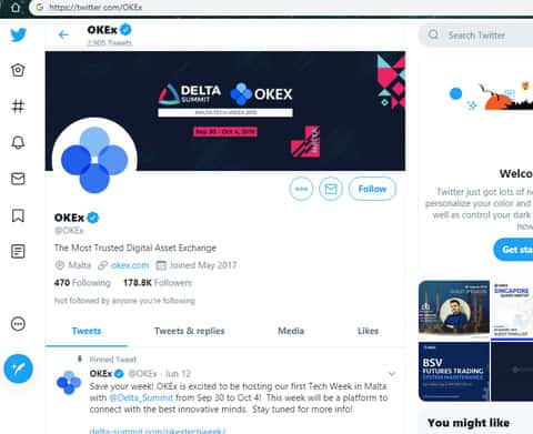 Имеется у жуликов ОКекс и страница в социальной сети Twitter, где мошенники OKEx накрутили более сотни тысяч подписчиков, а вот активности аудитории у лохотрона ОКекс в данной социальной сети абсолютно никакой не наблюдается. На изображении, расположенном ниже, вы можете наглядно увидеть страницу мошенников OKEx в социальной сети Твиттер.