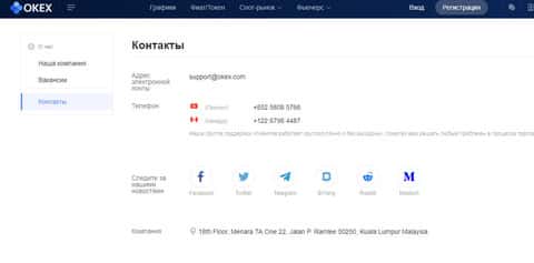 Под контакты мошенники ОКекс отвели отдельный раздел своего подвального сайта, в котором аферисты OKEx указали крайне мало контактов, которых не достаточно для вычисления личности жуликов ОКекс, к тому же видно и сами шулера OKEx не особо хотят общаться с клиентами. Непосредственно контакты мошенников ОКекс перечислим ниже: