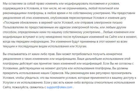 Далее аферисты ОКекс вообще заявляют о том, что они могут в любой момент по своему усмотрению изменить данные условия сотрудничества с мошенниками OKEx без предварительного уведомления, что практически лишает наивных пользователей любых прав. На изображении ниже вы можете увидеть очередной раздел клиентского соглашения аферистов ОКекс.