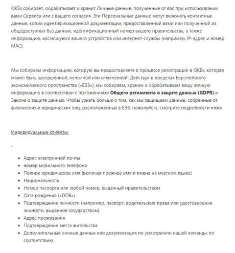 Далее в политике конфиденциальности у мошенников OKEx следует типичная "вода" о том, что лохотрон ОКекс в неограниченных масштабах собирает личные и персональные данные клиентов, которые в дальнейшем может использовать по своему усмотрению. На изображении, расположенном ниже, вы можете наглядно увидеть политику конфиденциальности жуликов OKEx.