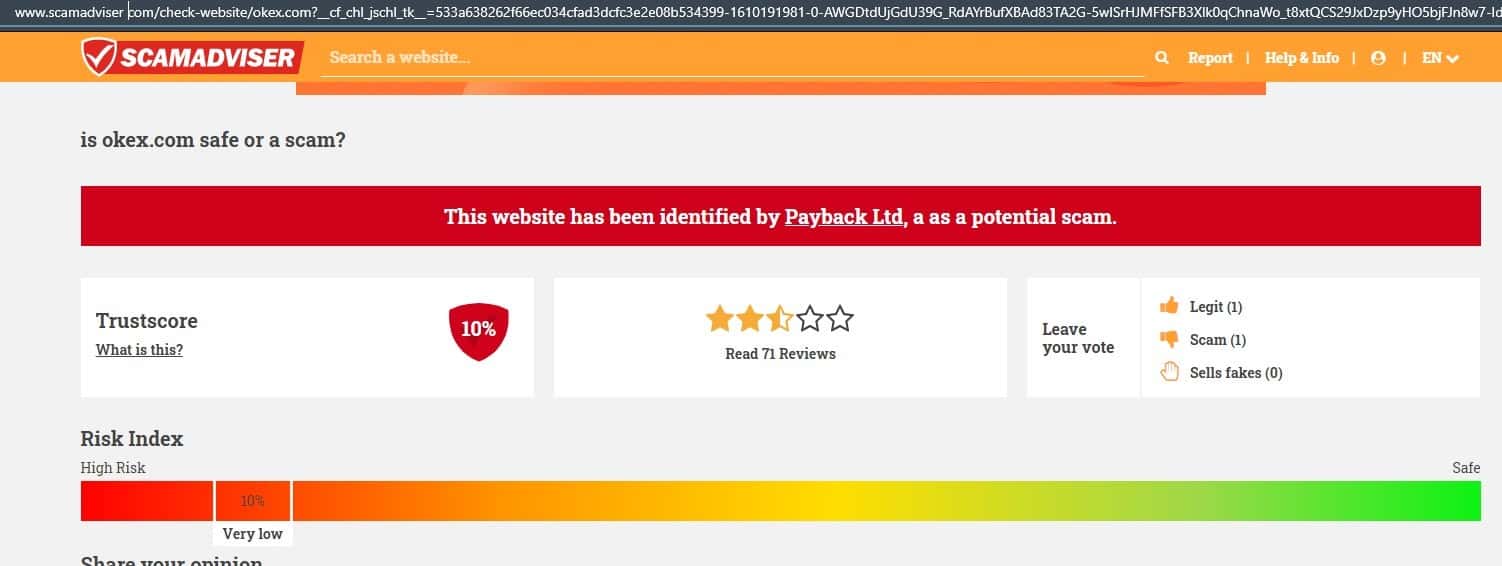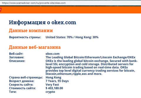 В связи с мошеннической и противозаконной деятельностью руководители аферистов ОКекс предпочитают анонимность дабы избежать ответственности со стороны правоохранительных органов. Информацию о сайте мошенников OKEx можно узнать с помощью портала scamadviser com, которую вы можете увидеть на изображении, расположенном ниже.