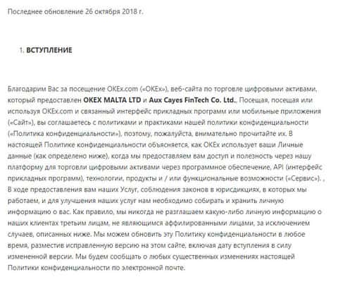 Начинаются условия сотрудничества с лохотроном ОКекс со стандартной воды о том, что это за документ и зачем он нужен. В ходе данного начала аферисты OKEx говорят о том, что они могут в любой момент и по своему усмотрению изменить данную политику конфиденциальности без предварительного уведомления, о чем вы можете прочесть ниже.