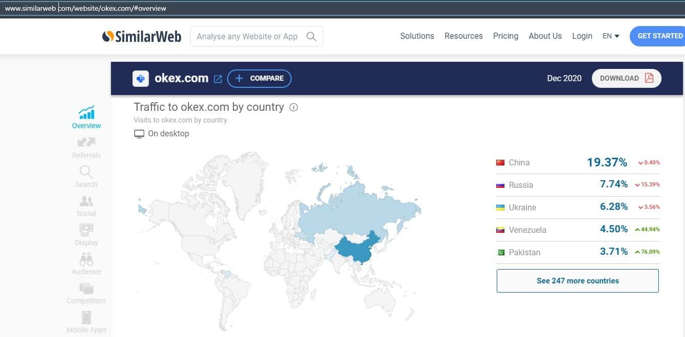 Далее представлена статистическая информация касательно трафика по сайту мошеннической биржи ОКекс. Среди стран также часто посещают клиенты из России и Украины.