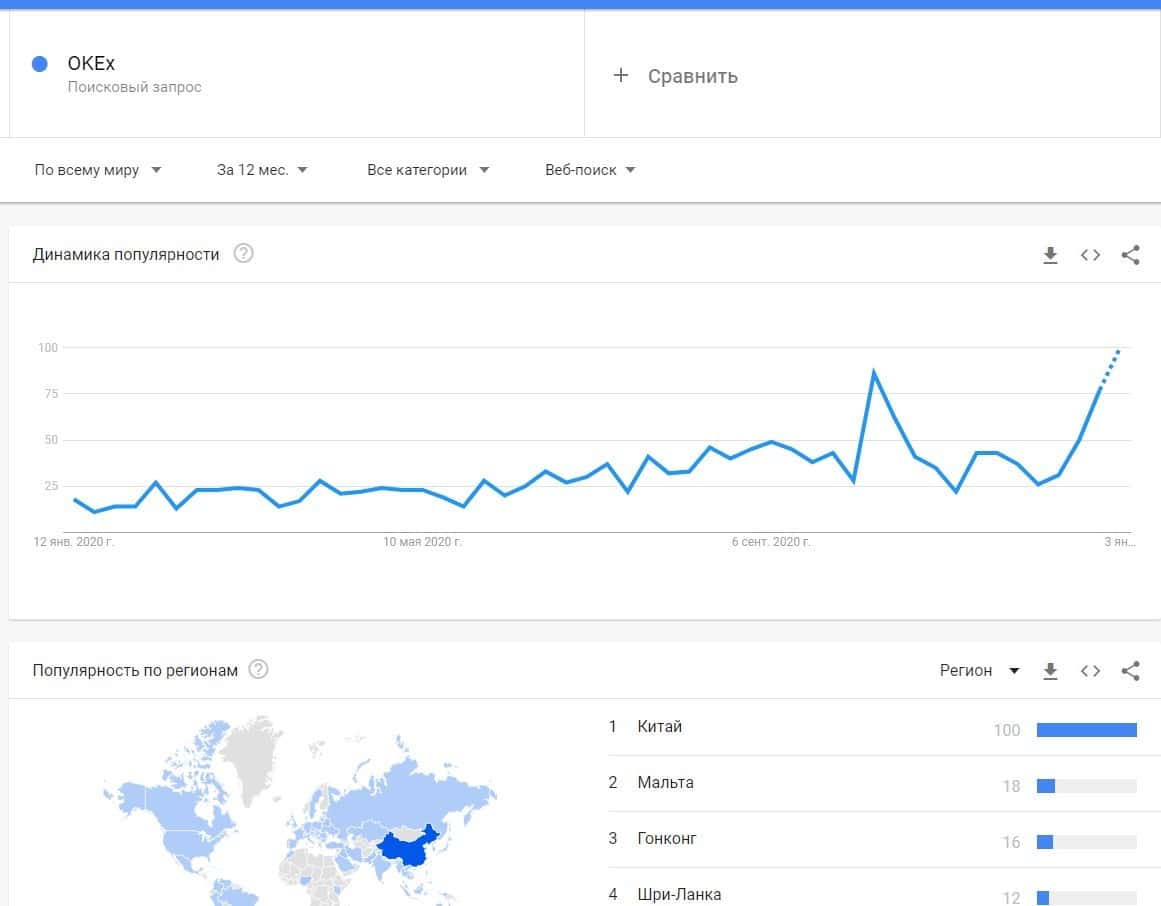Лохотронский бренд "OKEx" получил популярность в Гугл и соответственно большая часть запросов шли из таких стран как: Китай, Мальта, Гонконг и Шри-Ланка.