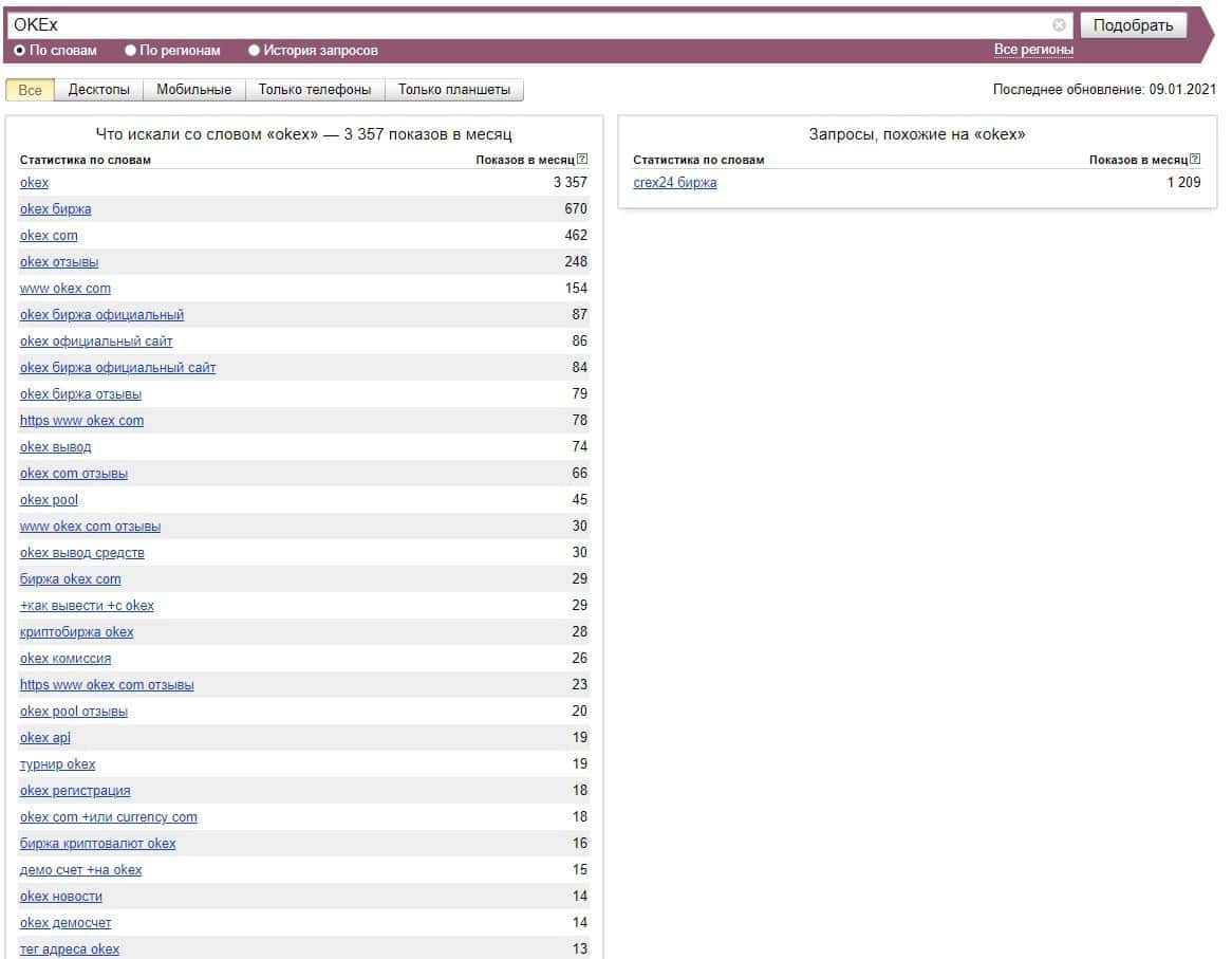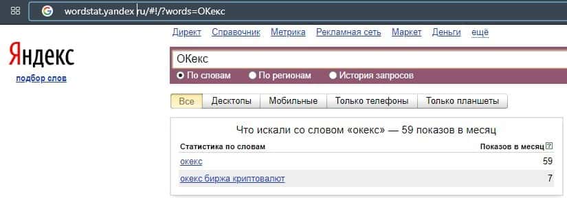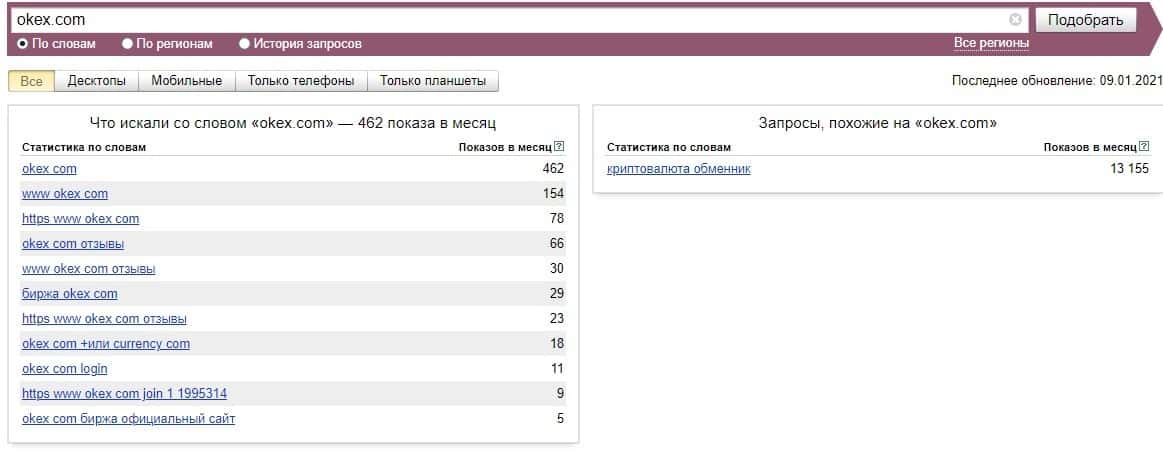 Ну и конечно же бренд "okex.com" по версии сервиса Яндекс.Вордстат набрала 462 показов, что показывает их некую популярность в сети интернет.