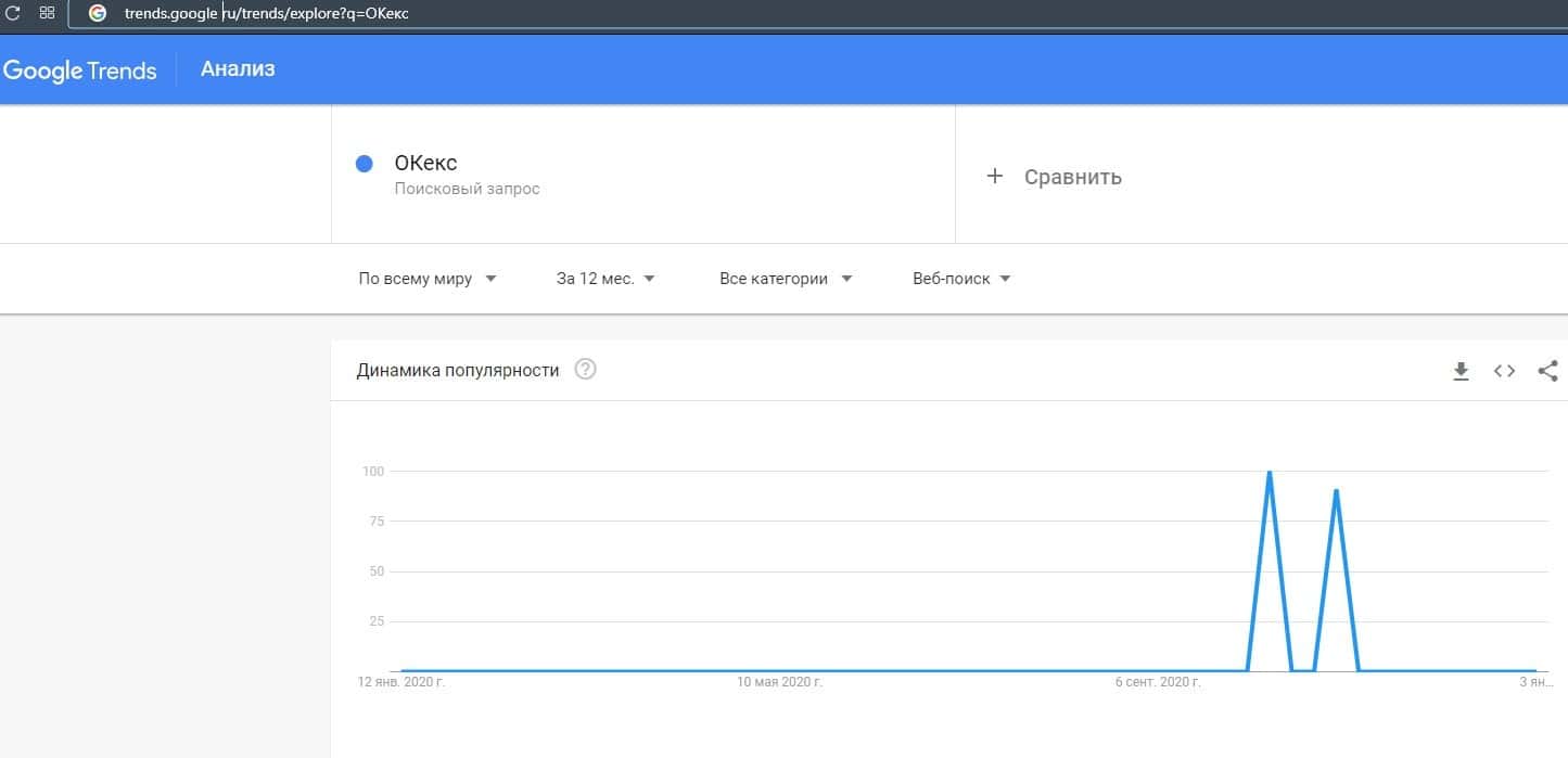 Что касается бренда криптовалютной конторы "ОКекс", то здесь есть немного запросов и в Гугл они популярны в некоторые моменты.