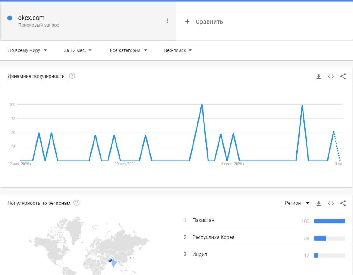 Бренд сайта "okex.com" все-таки ищется в поисковой системе Гугл и было совершено несколько запросов из Пакистана, Республики Корея и Индии по статистике системы Гугл.