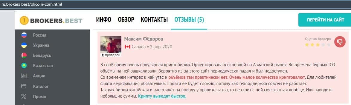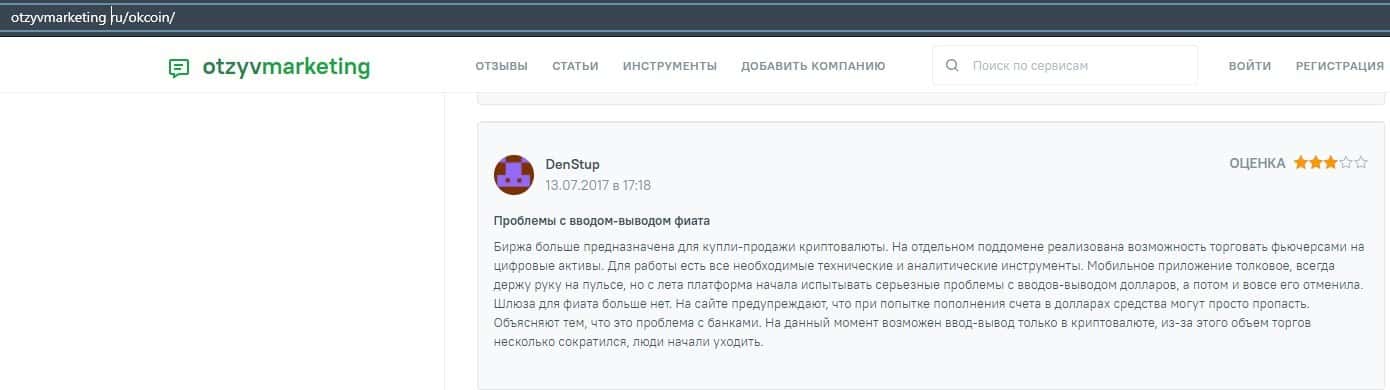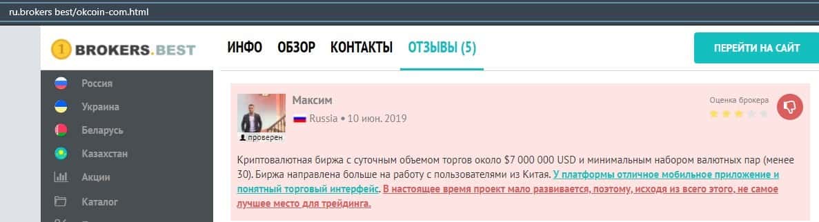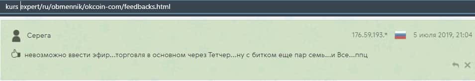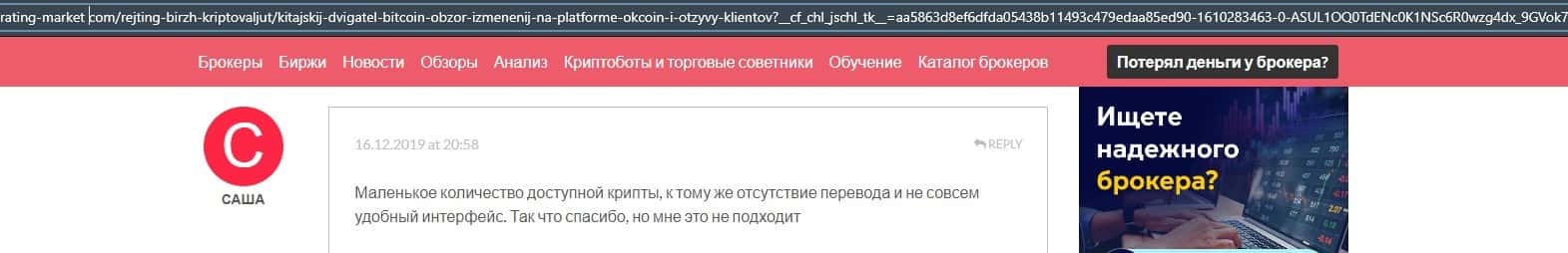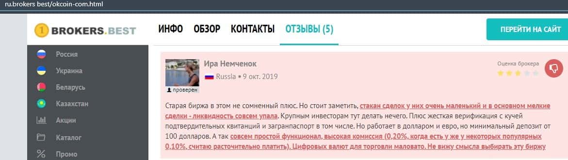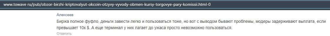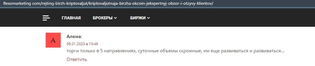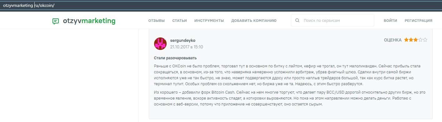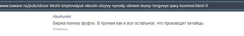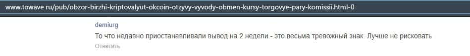 Очередной пользователь сети указал в отзыве, что контора ОККоин престала развиваться, поэтому он бы не рекомендовал биржу для совершения торговых операций с криптовалютой.