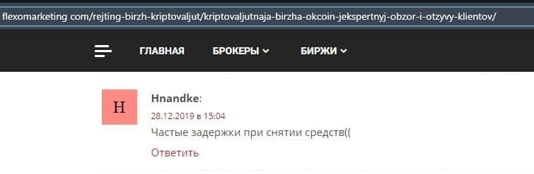 Человек утверждает, что в конторе ОККоин очень частые задержки при снятии средств. Это может возникнуть в любой момент и вы не сможете повлиять на этот процесс возврата денег.