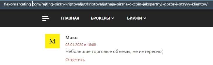 Автор отзыва не доволен работой крипто-конторы ОККоин, так как там очень маленькие объемы торговли, а также малое количество предоставленных криптовалют для трейдинга.