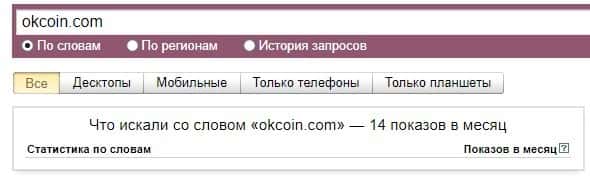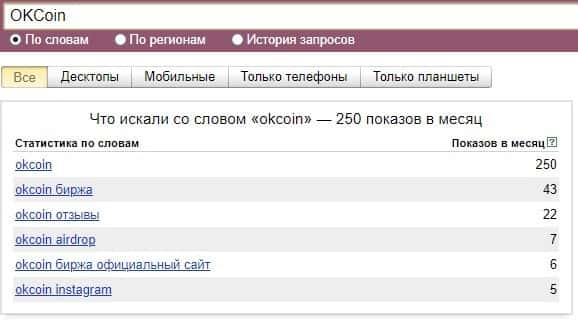 Немного другая ситуация и с англоязычным бренда "OKCoin", который по версии ресурса Яндекс.Вордстат, набрал всего 250 показов в месяц, что показывает некую популярность в сети.
