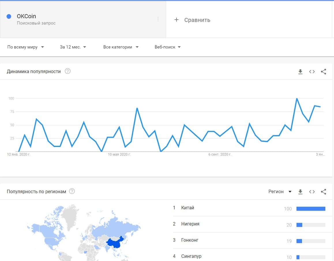 По поводу запроса бренда "OKCoin", то здесь стоит отметить, что за последние месяцы они набрали популярность в Гугл запросы шли из Китая, Нигерии, Гонконга и Сингапура.