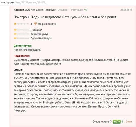 Человек по полной высказался по поводу аферистов Оксфорд Групп. Обвинения не с пустого места, так как они его оставили без жилья и каких-либо денег. Его тоже пригласили на собеседование, а потом предложили пройти обучение. Аферисты настолько втерлись в доверие к мошенникам, что жертва лохотрона взял кредитов на 2 миллиона рублей. Теперь шулера между собой разделили деньги, при чем часть в размере 400 000 рублей приписали в качестве оплата за обучение, а часть остальную кинули на счет. Все что было на счету у него все слили, оставив его один на один с кредитами и с заложенной квартирой.