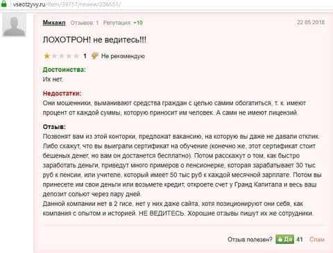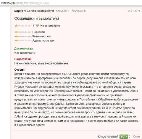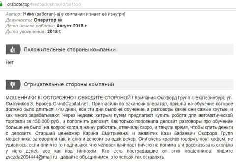 А следующий автор отзыва о кухне Oxford Group рассказал, как жулики даже сами находят резюме своих потенциальных клиентов и приглашают на работу, хотя изначально рассказывают об одной вакансии, а на деле совсем другое. Этот лохотрон предлагает пройти обучение бесплатно, а потом потихоньку подводят свою жертву к внесения депозита, для того, что бы начать торговать. Деньги уходят на счета брокера Grand Capital, которые потом либо невозможно вывести, либо просто сливают.