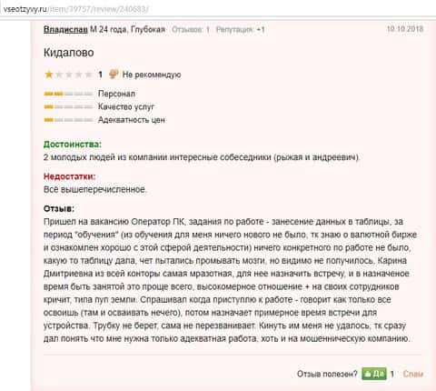 А вот следующего клиента мошенникам Оксфорд Груп не удалось развести, так как он раскусил их мошенническую схему еще до того, как он вложил в них свои деньги. Пришел он сначала к ним на собеседование по вакансии Оператор ПК, а ему стали рассказывать про валютный рынок. Карина Дмитриевна - так звали менеджера-афериста, которая пыталась развести человека, но ей так и не удалось. Он то был и не против там поработать, только по их сторону баррикад, но ему отказали.