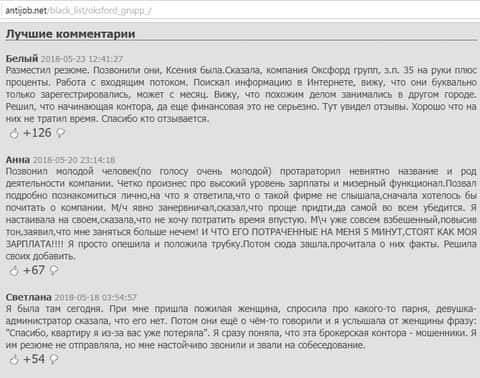 Некоторые люди раскусили контору Оксфорд Групп сразу, а некоторые попались таки к ним на крючок. Аферисты заманивают своих жертв, посредством сайтов для работодателей, где находят резюме людей и собирают базы своих жертв. Таким образом у мошенников на руках бесплатная база жертв, которых можно обрабатывать. Люди с дуру берут кредиты, закладывают автомобили и недвижимость, а шулера Oxford Group набивают себе карманы.