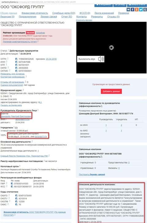 Как нам стало известно с официального реестра компаний Российской Федерации, а именно с сайта zachstnyibiznes ru, мошенническая организация ООО "Оксфорд Груп" зарегистрирована под ОГРН 1186658032846 с уставным капиталом в 10 000 рублей!!!. Также удалось узнать, что руководитель юридического лица, а также учредитель конторы, является некий Шинкарев Дмитрий Викторович у которого ИНН 561018077174. Судя из нашей практики обычно в таких конторах выступает директором подставное лицо, которое либо просто получает за регистрацию на себя контору, за что и получает процент, либо вообще не знает о существовании данной организации. Также в реестре указано, что Oxford Group имеет основной вид экономической деятельности это - "консультирование по вопросам коммерческой деятельности и управления". Так что контора за вуалировалась и никакие правоохранительные органы привлечь к ответственности не могут.
