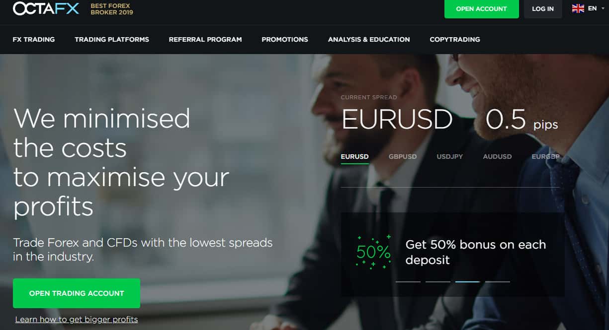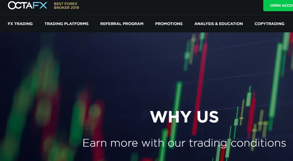 Начинается сайт у лохотрона OctaFX с довольно стандартной шапки сайта, в которой у аферистов Окта ФХ имеется стандартная лапша на уши наивной клиентуре, под предлогом которой жулики OctaFX предлагают пользователям сети открыть у них счет. На изображении ниже вы можете увидеть очередной раздел сайта шулеров Окта ФХ.