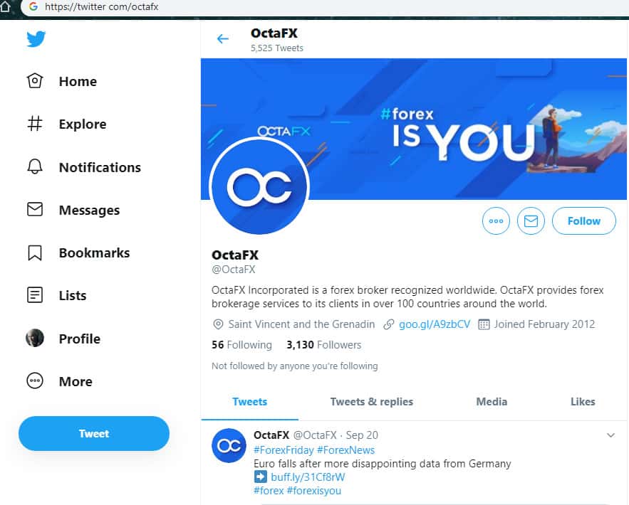 Имеется у лохотрона OctaFX и страница в социально сети Twitter, где шулера Окта ФХ имеют всего несколько тысяч подписчиков, которые даже не проявляют активности на странице аферистов OctaFX, хотя и не вооруженным глазом видно халтуру жулья Окта ФХ. На изображении ниже вы можете увидеть страницу аферистов OctaFX в Твиттер.