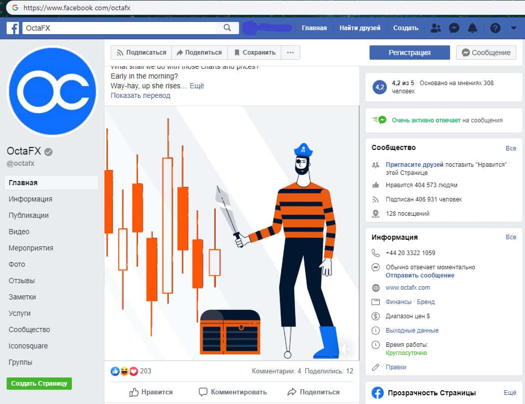 Дабы соответствовать современным трендам мошенники OctaFX обзавелись страницами в социальных сетях, одной из которых стал Facebook, где аферисты Окта ФХ определенно не пожалели денег и накрутили несколько сотен тысяч подписчиков на аккаунт. На изображении, расположенном ниже, вы можете увидеть страницу шулеров OctaFX.