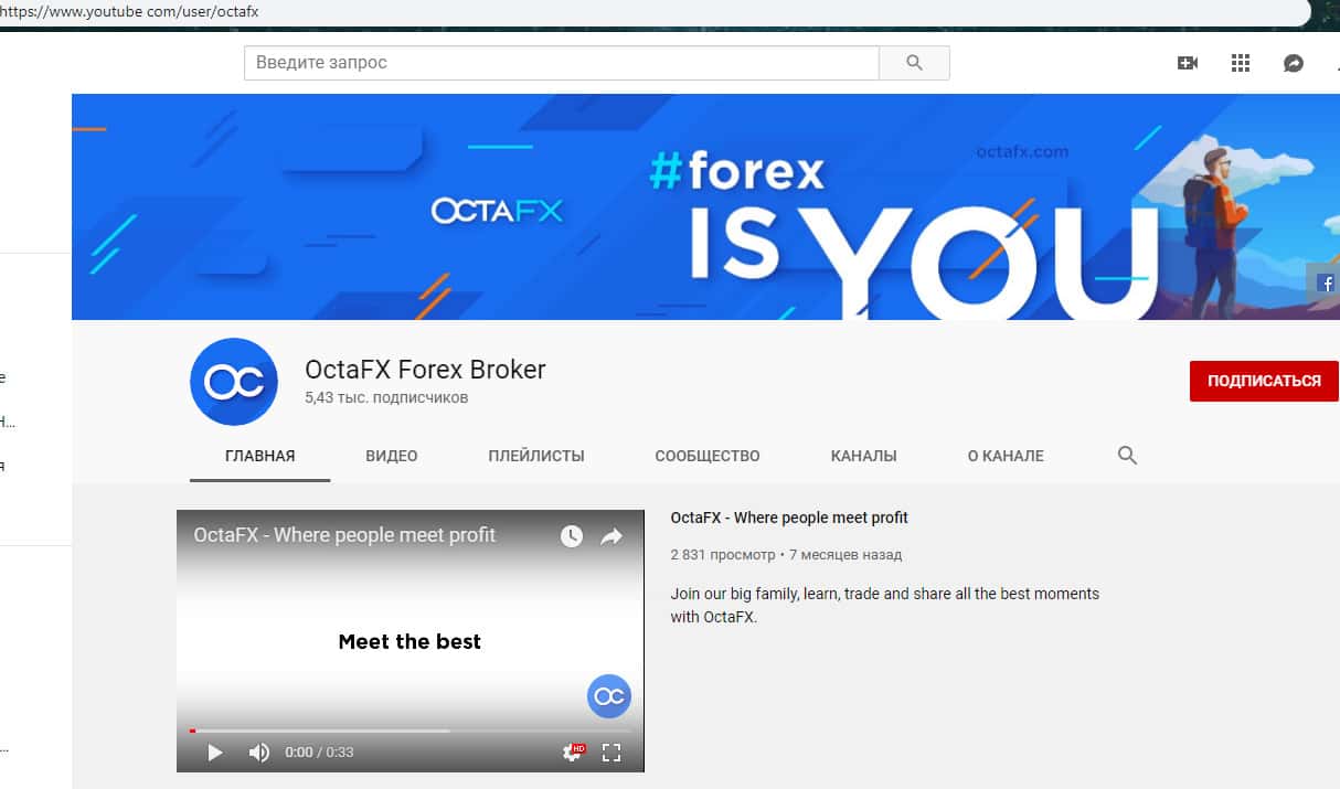 Для размещения различных рекламных и мотивационных видеороликов мошенники OctaFX обзавелись страницей в социальной сети Ютубе, где лохотрон Окта ФХ срыл реальное количество своих подписчиков, однако, судя по количеству просмотров, жулики OctaFX не пользуются популярностью и здесь.