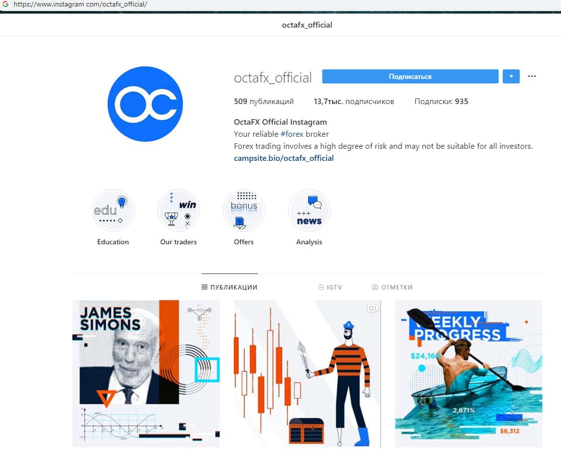 Так же обзавелся лохотрон Окта ФХ и страницей в нынче популярной социальной сети Инстаграм, где шулера OctaFX потратились на накрутку более десяти тысяч подписчиков, о чем говорит довольно низкая популярность шулеров Окта ФХ у наивных пользователей. На изображении ниже вы можете увидеть внешний вид страницы жуликов OctaFX.