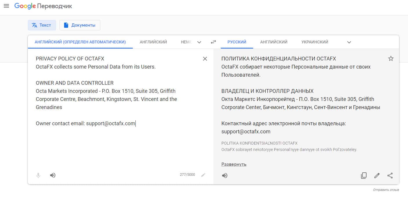 Дополнительным преимуществом для шулеров Окта ФХ является факт их оффшорной регистрации, а именно: Suite 305, Griffith Corporate Centre, Beachmont, Kingstown, St. Vincent and the Grenadines, что дает мошенникам OctaFX дополнительную анонимность счетов и владельцев.
