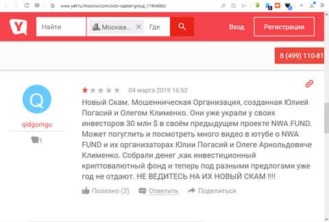 На портале yell ru есть страница, созданная для отзывов о работе инвест-конторы ОКТО Капитал, большинство которых отрицательные (около 100%). Один из таких пользователей оставил комментарий под псевдонимом "qidgomgu", что вся эта мошенническая контора является просто скамом, ещё одним проектом-лохотроном распиарившихся в сети Юлии Погасий и Олеге Арнольдовиче Клименко.