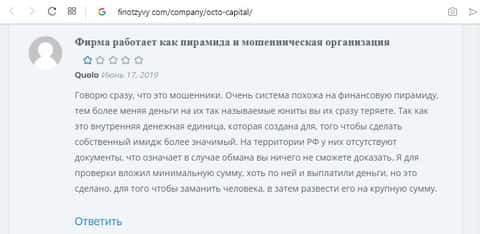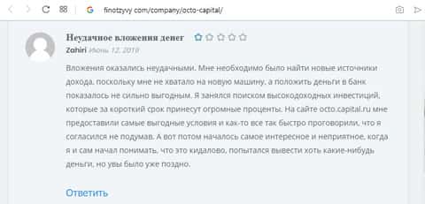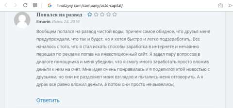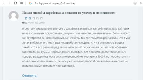 Пользователь Rist решил написать отзыв о всей кухне этой мошеннической конторе ОКТО Капитал, о том как он попался на эту удочку, он просто искал способы заработка денег в интернете, преимущественно пассивных, то есть автоматических способов. Тут же он находит видео на Ютубе, которое восхваляет работу ОКТО Капитал. И он, не колеблясь, решает вложить свои честно заработанные деньги в мошенническую кухню.